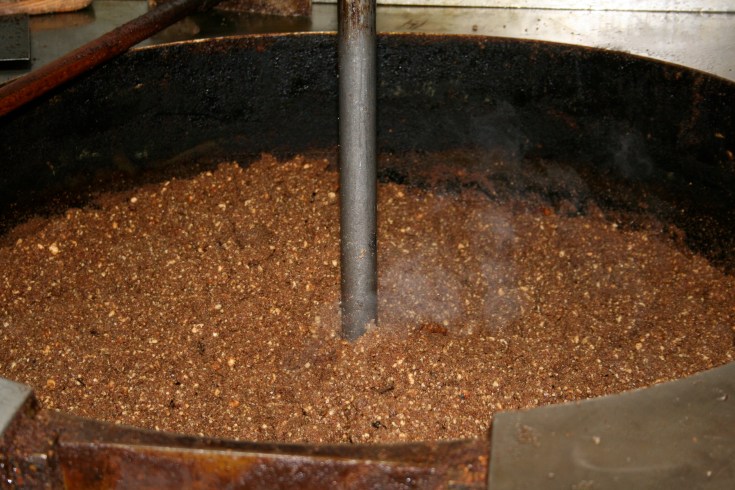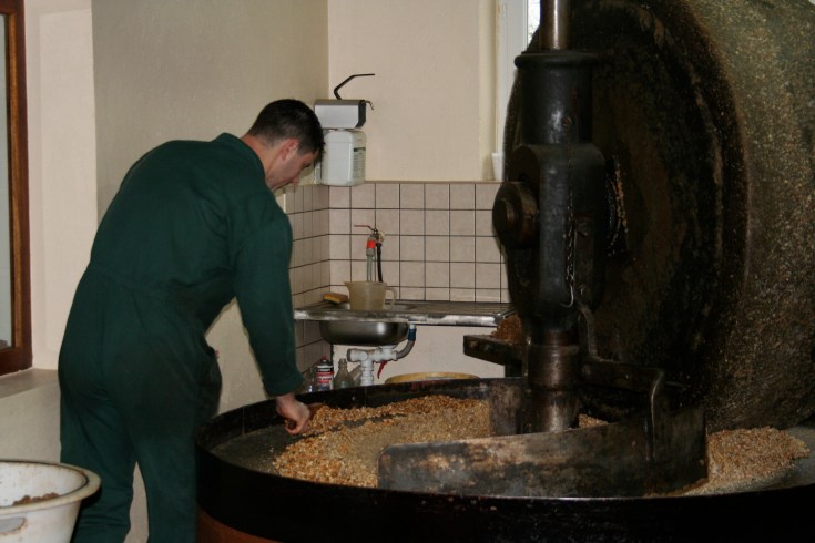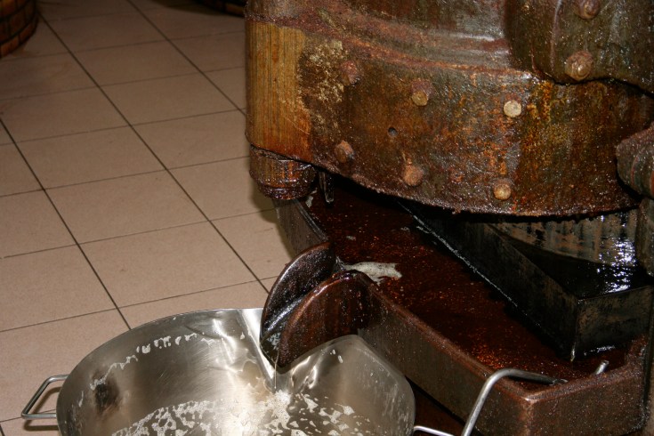 L’huile de repasse est obtenue en rajoutant de l’eau au tourteau et en pressant de nouveau. Cette huile est moins parfumée et plus foncée.