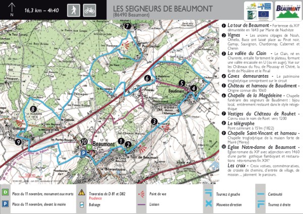 Le chemin des seigneurs de Beaumont vous mène au pied des ruines de la Tour de Beaumont, à Baudiment Rouhet en passant pa la chapelle de la Madeleine. Vous rejoindrez le Télégraphe puis l'église romane. Nous vous souhaitons de belles découvertes.